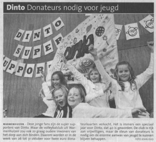 Komende week gaan de Dintoleden weer door de straten van Warmenhuizen om huis aan huis donateurkaarten aan de man te brengen. Voor slechts € 2.00 wordt de club gesteund en kan zij ondermeer blijven investeren in goede jeugdopleidingen, daarmee werkend aan de toekomst van volleyballend Warmenhuizen.