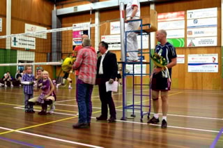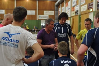 Net als bij de vrouwen nam ook bij de mannenhoofdmacht een icoon van Dinto afscheid. Spelverdeler Sander van den Berg hangt de schoenen aan de wilgen. “Volgend seizoen wil ik nog wel blijven trainen. Er is een kleintje op komst en ik wil daardoor de zaterdagen vrij hebben.” Van den Berg is altijd multifunctioneel geweest. Zo speelde hij op de diagonaal, buitenkant, middenblokkering en dus de laatste jaren als spelverdeler. Een optreden in een lager team ziet hij vooralsnog niet zitten. “Ik hoop in de toekomst met wat meer oudgedienden in bijvoorbeeld in de regiodivisie te spelen. Maar voor komend jaar is het dus alleen door het weeks trainen, mits er plaats is in de selectie, want ik kan me goed voorstellen dat er ruimte wordt geboden aan aanstormend talent.” Van den Berg startte in de basis, maakte met zijn service direct het eerste punt, maar zag zijn team vervolgens flink achterkomen:8-15. Met een excellerende Jurgen van Baar poetste Dinto de achterstand volledig weg. Een kill-block van Rick van Broekhoven zorgde voor de eerste winst:27-25. Twee zeer zwakke sets (19-25 en 14-25) deden het ergste vrezen voor de thuisploeg. Verblaauw bracht George Nieuwland in de selectie en een opslagreeks van Wessel Blom bracht Dinto op een flinke voorsprong:10-2. Eenvoudig speelde de ploeg zich naar een beslissende set:25-13. Tot de veldwissel leek er door harde smashes van Charles Bos niets aan de hand:8-7. Door enkele knullige fouten liet Dinto de Amsterdammers echter alsnog ontsnappen:12-15.
