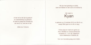 Op maandag 18 oktober is Kyan geboren, zoon van Rick en Mariëlle Breeuwer, broertje van Ychenne.