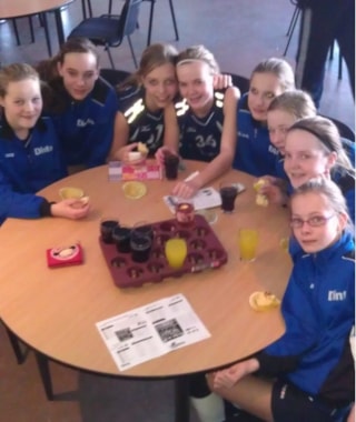 Op de foto zien we de meiden C1 aan de overwinningstaart in de kantine