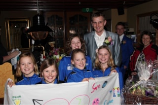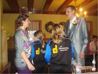 Afgelopen vrijdag 1 maart trouwde hun trainer Martin met Ellen, zijn trainingsgroep wilde dit niet zomaar voorbij laten gaan. Dus trokken de meiden met een prachtig spandoek en manden met voorjaarsbollen naar restaurant de Ooievaar om het kersverse echtpaar te feliciteren