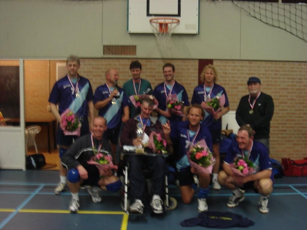Onze mannen van heren 4 zijn donderdagavond in Schagen kampioen in de tweede klasse geworden. De ploeg heeft het hele jaar bovenaan gestaan en moest door de verrassende winst van The Serve op concurrent Alvoco slechts één set winnen voor de titel. Tegenstander Polisport had echter bij een 4-0 winst ook nog kans op het kampioenschap. Het werd een zenuwslopende strijd,waarin in de eerste twee sets de Schager hoofdmacht aan het langste eind trok. Bij een 19-24 stand in de derde set was het eerste kampioenschapspunt een feit. Luid aangemoedigd door Frank Koopman, Bob Versteegh,voorzitter Bobbes de Ruyter en het voltallige Dames 3 pakten onze helden uiteindelijk de set en het kampioenschap. Dit werd tot ver in de kleine uurtjes in de Doorbraak gevierd !