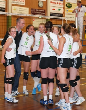 Het was door de belangen en het afscheid van het “boegbeeld” Simone van Haneghem dus niet zo maar een wedstrijd. De thuisploeg was gedreven. Een kill-block van Nikki Meijer zette direct de toon. Ysabel Maréchal speelde veelvuldig de sterke Floortje Kok aan op de diagonaal. Volta had veel moeite met de zware servicedruk en werd met 25-14 weggespeeld. Met Geertje de Groot in de spelverdeling bleek de tweede set een kopie van het eerste deel. Bianca Stoop en Simone van Haneghem hadden weinig moeite om de blokkering te passeren. Volta kon met korte tactische ballen over de middenblokkering net wat meer punten binnenhalen als in het eerste deel: 25-19. Breeuwer bracht vervolgens Irene Bos en Josien Oud binnen de lijnen. Met strakke opslagen van Floortje Kok liep de set uit op een afstraffing: 25-6. De scherpe kantjes leken er daarna een beetje af bij Dinto. Afgezien van een prachtige driemeteraanval van Josien Oud was er weinig te genieten voor het thuispubliek in deze fase. Dinto kwam verrassend met 10-14 achter. Misschien wel realiserend, dat dit de laatste set zou kunnen zijn, nam Simone van Haneghem hoogstpersoonlijk haar team op sleeptouw. De Schagerbrugse beukte de ene na de andere bal snoeihard langs en over de blokkering. Bij een 22-22 stand serveerde zij haar ploeg naar matchpoint: 24-22. Het was het moment voor Breeuwer om op gepaste wijze de scheidende speelsters in het zonnetje te zetten. Onder luid applaus en met een roos van de wisselspeelsters gingen achtereenvolgens Simone van Haneghem, Geertje de Groot en Bianca Stoop naar de kant. Na dit mooie moment moest natuurlijk nog wel het laatste punt binnengehaald worden. Irene Bos liet een fraaie opslag zien, Dinto kwam daardoor in de rally en het was uiteindelijk Floortje Kok die met een hard via de blokkering geslagen bal de volle winst verzekerde: 25-22. Vanaf volgende week mag Dinto proberen in twee wedstrijden promotie naar de eerste divisie af te dwingen.