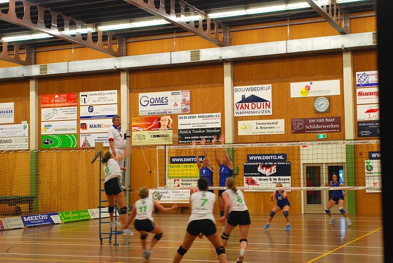 Dinto kon van acquit verrassend goed tegenstand bieden aan de Friese eerstedivisionist. De thuisploeg kon zonder enige spanning aan het duel beginnen. Voor Dinto was het treffen “slechts”een toetje op het prima verlopen seizoen. Dio, dat ongelukkigerwijs tot deze duels gedwongen was, voelde de druk van het zich moeten handhaven. Simone van Haneghem had al afscheid genomen van de Warmenhuizer hoofdmacht, maar was uiterst gemotiveerd om promotie te bewerkstelligen. De sterk spelende Ysabel Maréchal speelde haar veelvuldig aan en het resulteerde in een vlekkeloze side-out. Dio had door prima verdedigende acties van Bianca Stoop daarentegen moeite om direct te scoren. Na een kill-block van Esther Smit en een schitterende doortik achterover van Maréchal sloeg Dinto een klein gaatje: 17-15. Floortje Kok maakte met prachtige driemeters en snoeiharde smashes op rechtsvoor de set eenvoudig uit: 25-20. De coach van Dio wist zijn team vervolgens prima om te zetten. De tweede spelverdeelster verhuisde naar de diagonaalpositie en de linkshandige driemeteraanvalster verscheen in het centrum. Dinto had veel moeite om blokkerend een antwoord op deze fantastische speelster te vinden. Met 19-25 trok de ploeg uit Oosterwolde de stand gelijk. Rick Breeuwer bracht vervolgens Irene Bos binnen de lijnen. Aanvankelijk leek Dio het duel te kunnen keren, maar onder aanvoering van een ontketende Simone van Haneghem werden de gasten steeds vaker afgetroefd. Door een 25-20 setwinst leek de Warmenhuizer tweededivisionist voor een verrassing te kunnen gaan zorgen. Met Nikki Meijer sterk spelend in het centrum pakte Dinto gelijk een 8-4 voorsprong. Irene Bos had volledig grip op de belangrijkste middenaanvalster en ook defensief was het bij Dinto prima voor elkaar: 14-5. Breeuwer bracht vervolgens Josien Oud en Geertje de Groot binnen de lijnen. In de slotfase van de set wist de thuisploeg door opportunistisch aanvalspel van Simone van Haneghem en ijzersterk serveren van Irene Bos een tussensprint van de bezoeksters prima te pareren: 25-16. Als Dinto in het uittreffen twee sets pakt, is de ploeg gepromoveerd. Bij een 3-1 verlies zal het om setpunten gaan. Het ruime coëfficiënt spreekt duidelijk in het voordeel van het Warmenhuizer vlaggenschip. Dinto zal in Oosterwolde alle steun krijgen, want een groot gedeelte van het ruim opgekomen thuispubliek zal om 14.00 uur in het Boekhorst Sportcomplex wederom van de partij zijn.
