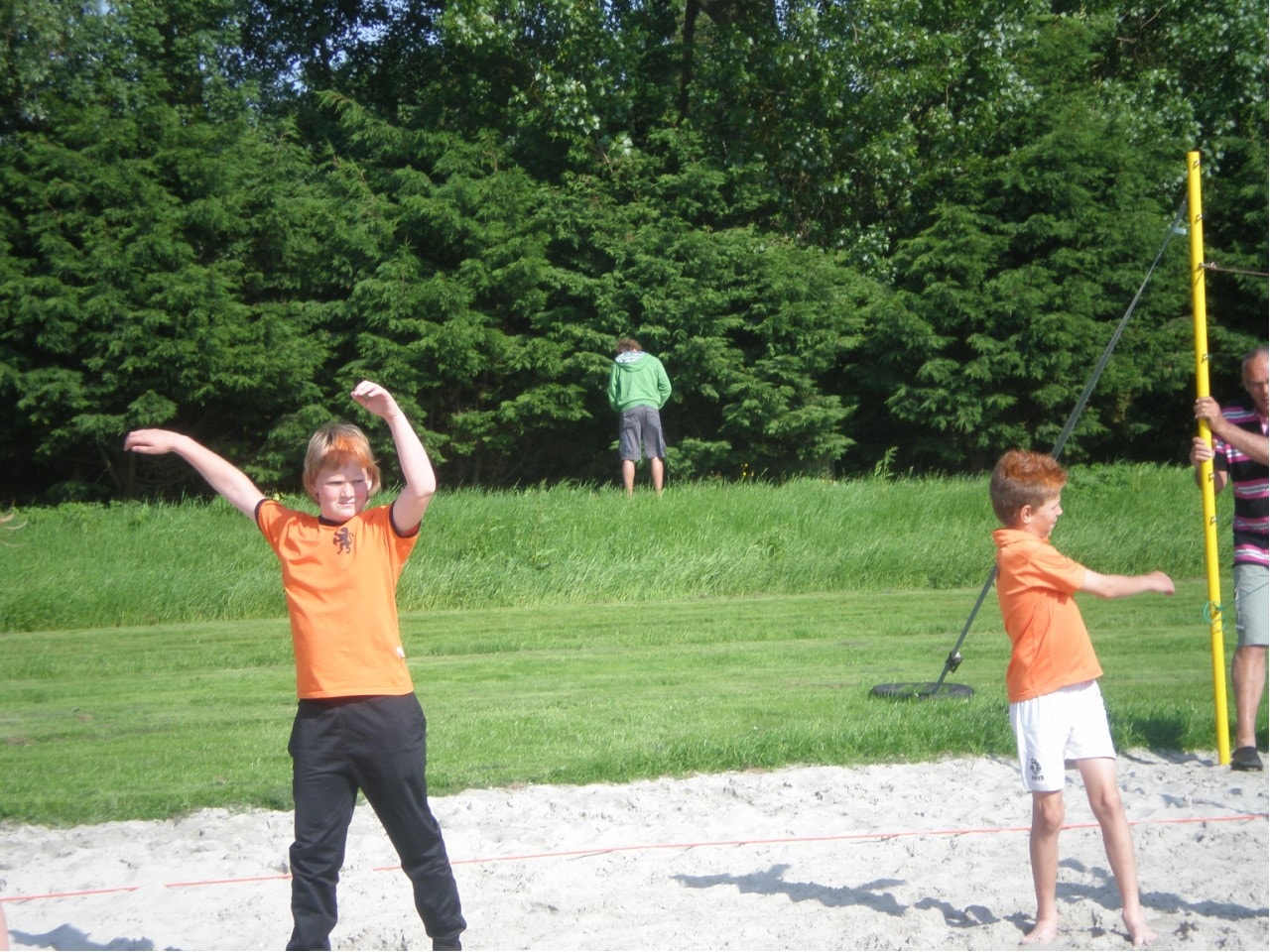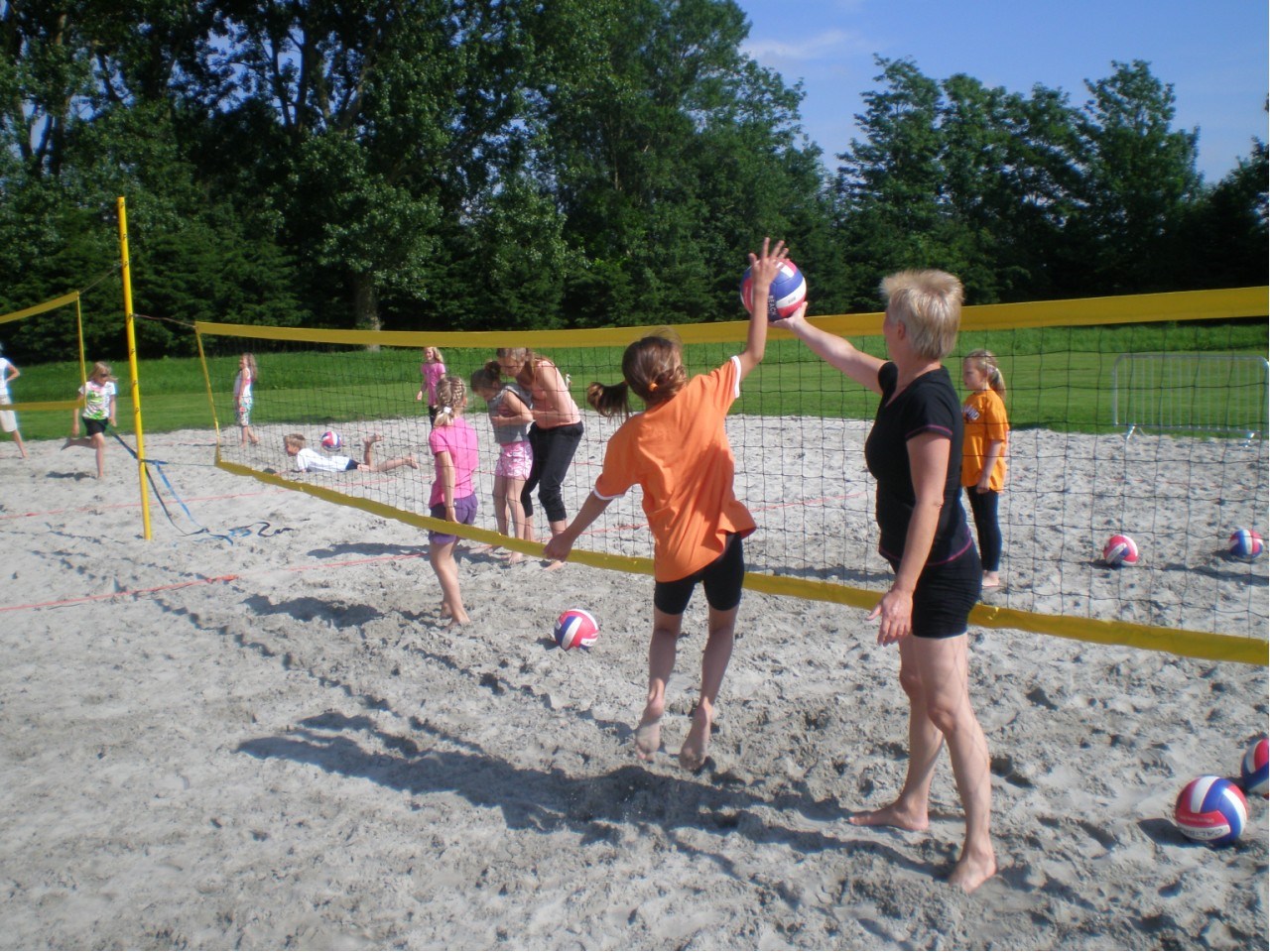 Gelukkig scheen afgelopen maandag de zon en kon er weer lekker worden getraind bij ”de Zandbak” De opkomst was iets minder groot, misschien waren sommigen de overwinning van Nederland op Denemarken nog aan het vieren. In ieder geval waren er heel wat beachers op de oranje tour met shirts en oranje haar. Iedere zaterdag van 10.00-12.00 kan de jeugd laten zien wat ze allemaal hebben geleerd op de training in de onderlinge competitie. Van te voren aanmelden is niet noodzakelijk, kom gewoon op tijd en speel mee. Ook als je alleen bent kan je meedoen, de teams worden bij ”de Zandbak” samengesteld.