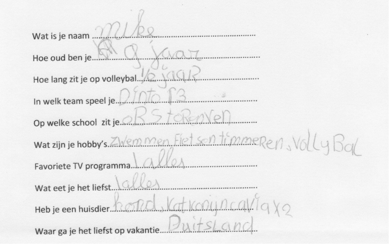 Mike is pupil bij De Nijs/Dinto - SDS H1, hij gaat de eerste bal van de wedstrijd serveren en daarna samen met Robin en de Dinto Super Supporters (team 17 en 13) de mannen en vrouwen aanmoedigen met ratels en toeters vanaf de tribune.