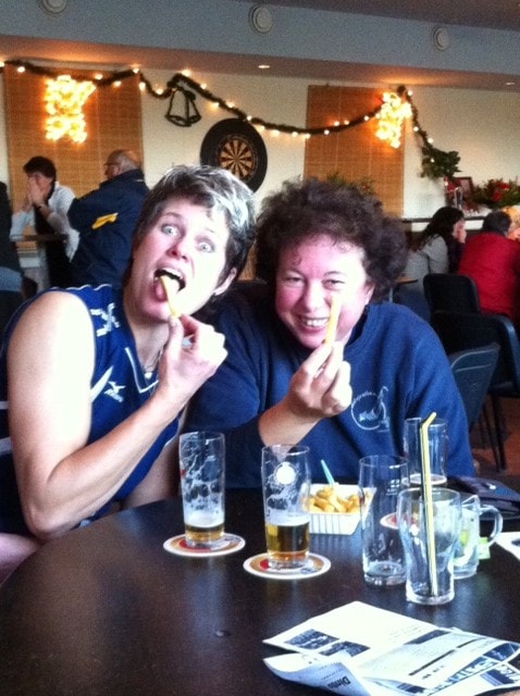 Om 13.30 was het eerst de beurt aan Dinto dames 3. Om koploper in het klassement te blijven, moesten zij hun directe concurrent Tevoko ds2 verslaan. Al gelijk vanaf het begin zaten de dames mentaal goed in hun vel en de eerste set werd met 25-14 redelijk gemakkelijk binnengehaald. Interim coach Jean Dekker wist ook in de 2e set de rust te behouden. Bij een achterstand van 08-10 nam hij een time out om even de korte paniek die toen ontstond, te doorbreken. Daarna moest er wel flink gewerkt worden, maar door een goede service en het inbrengen van Anita Koopman wisten de meiden ook deze set naar zich toe te trekken met 25-20. In de derde en vierde set was er veel servicedruk van met name Monica de Goede en Leonie Schipper. Hierdoor kwam de passing van Tevoko enorm onder druk te staan. Deze laatste sets werden dan ook vrij gemakkelijk gewonnen met 25-11 en 25-10. Door deze winst staat Dinto ds 3 met 41 punten uit 9 wedstrijden bovenaan in de 2e klasse. Tevoko heeft inmiddels met 10 wedstrijden 37 punten. Om deze overwinning te vieren, namen de meiden gezellig een borrel in de kantine en werd het feestje daarna voortgezet in Huize Eva Schipper. Beginopstelling Dinto: Machteld vd Haar, Marieke Pronk, Monica de Goede, Eva Schipper, Leonie Schipper en Atinka Koeman.