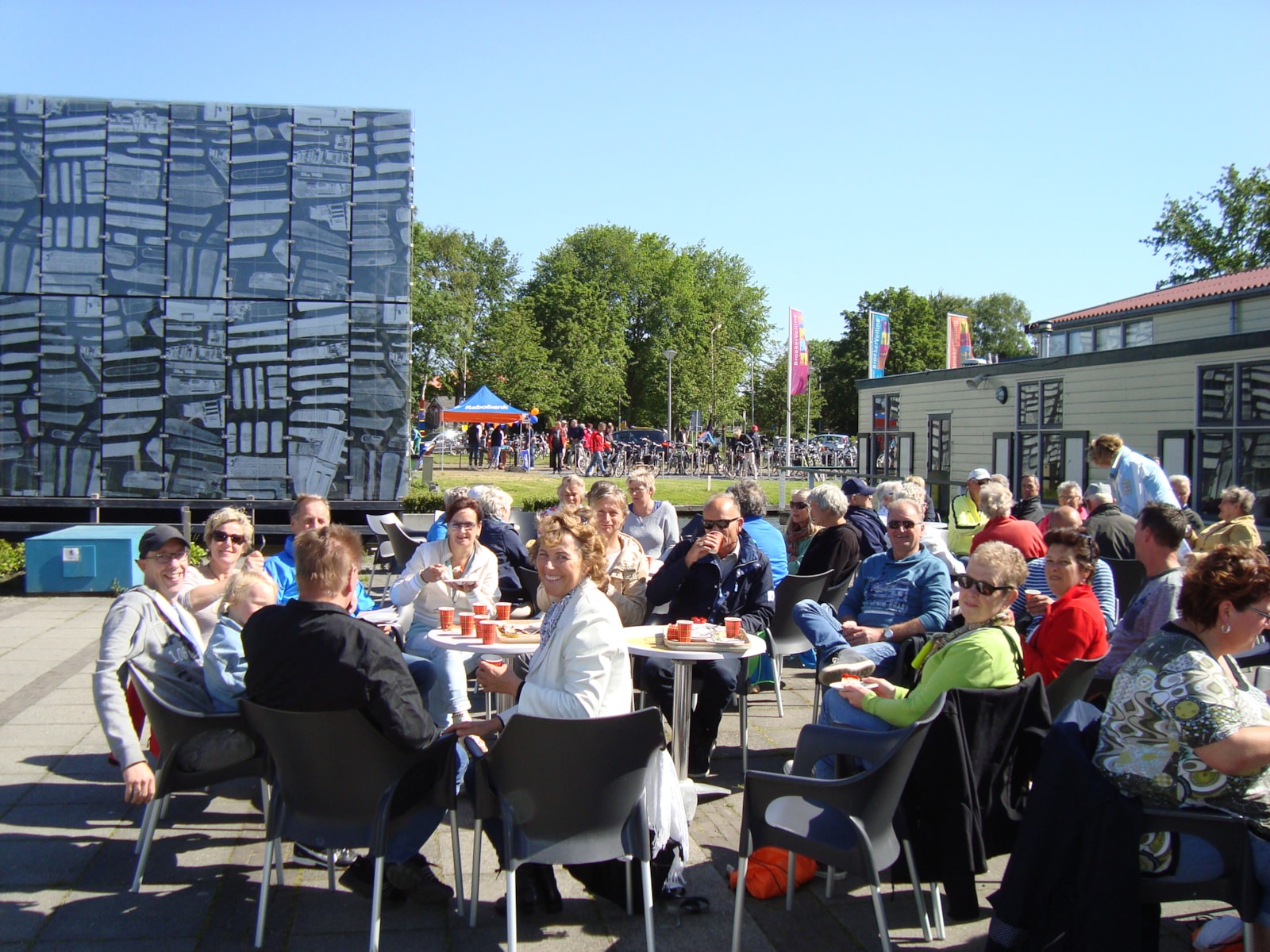 Afgelopen zaterdag 6 juni trokken 13 mannen en vrouwen met een Dinto-hart op de fiets door de regio. De jaarlijkse Rabobank Fietssponsortocht stond weer op het programma. Er werd gestart bij De Bongerd in Kalverdijk en er werd gefietst langs Tuitjenhorn en door het Geestmerambacht naar de Broekerveiling alwaar een stempelpost te vinden was. Daar aangekomen werd er opgestoken voor koffie/thee/limonade met een flinke punt gebak met muzikale begeleiding van een rood/wit gekleurd dameskoor. Na deze versnapering werd de tocht voortgezet langs de Rabobank aan de Voorburggracht (stempelpost) richting De Buizerd en daarna via Waarland weer terug naar de Bongerd. Het tempo zat er goed in mede dankzij o.a. Cor Beemsterboer die namens de skeelervereniging ook aan het fietsen was. Zo hebben de volgende mensen weer € 300,- voor de clubkas bij elkaar gefietst: Sjaak Pronk, Sjaak Meijer, Henny Ligthart, Gerard Jongejan, José Been, Frank Filee, Anja Verkamman, Jos en Gerrie van Baar, Peter en Christa Jongejan en tot slot Joost en Lotte Goudsblom.