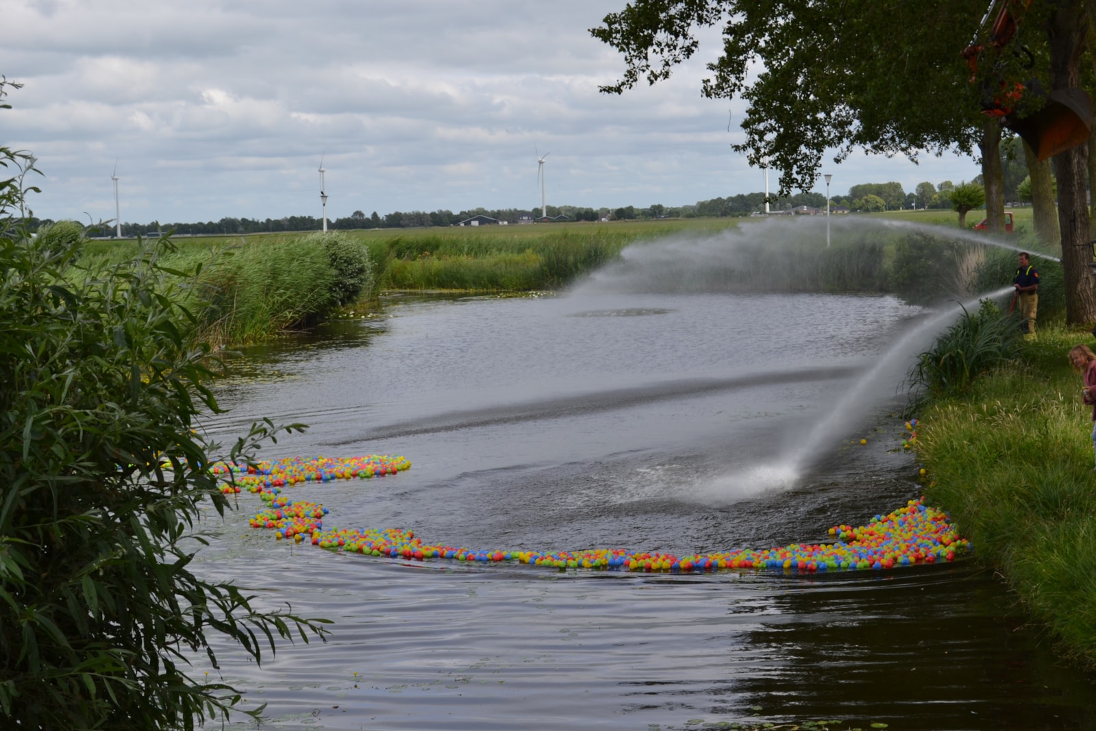 Inmiddels begon het ook al drukker te worden met toeschouwers, zelfs Duitsers wilden nog meedoen aan dit evenement. We begonnen ons al een beetje zorgen te maken aangezien de wind lichtelijk begon te draaien. Desondanks werd de bak van Jan Bruin zijn kraan gevuld met alle badeendjes (3000 stuks), het paste precies. Om 16.00 uur was het zover. Er werd afgeteld van 10 naar 1 en los gingen de eenden.